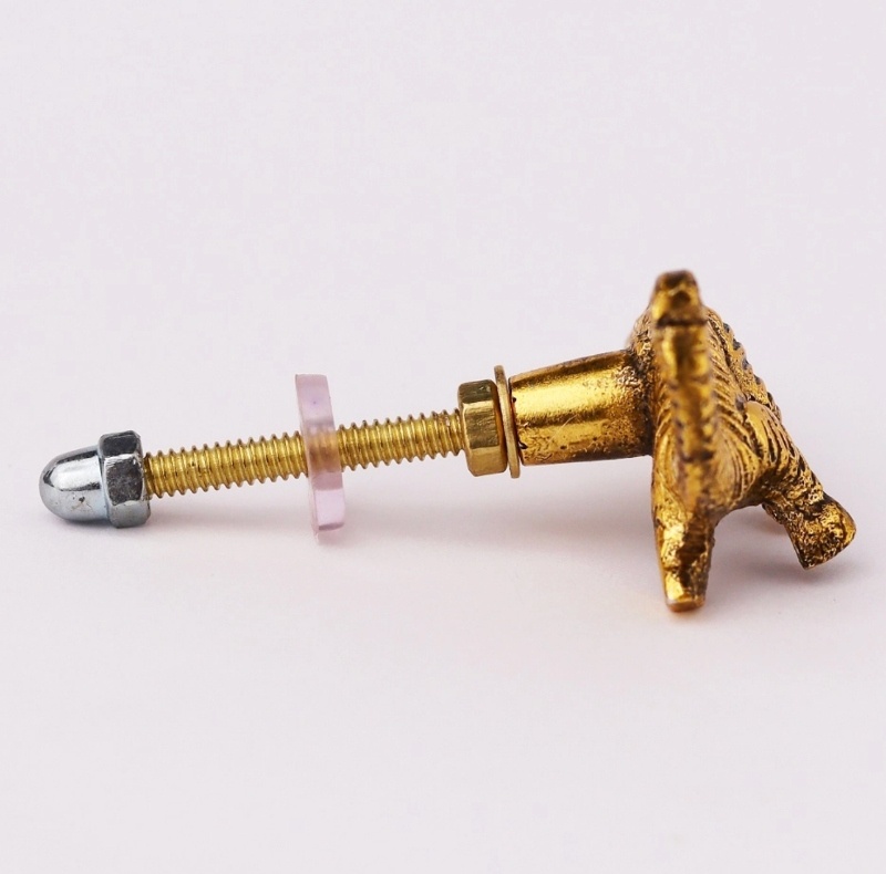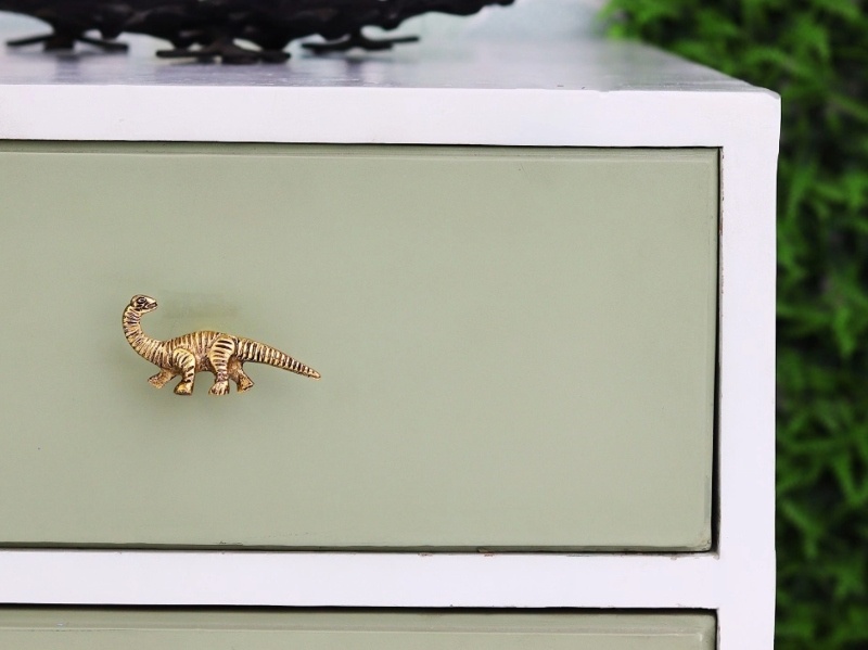 Geef de kinderkamer een prehistorisch accent met deze prachtige kastknop in de vorm van een brachiosaurus. Deze dino-knop is vervaardigd uit metaal en afgewerkt in een warme, goudkleurige toon met mooie details. Ideaal voor het toevoegen van een fantasierijke, speelse touch aan laden, kastjes of commodes.