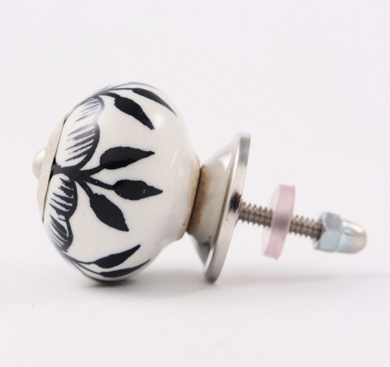 Porseleinen kastknop met zwarte bloem Deze stijlvolle kastknop van wit porselein is versierd met een handgeschilderd zwart bloemenmotief en afgewerkt met een klassiek antiek koper rozet. De elegante bloemvorm en het subtiele kleurcontrast geven een speelse én tijdloze uitstraling aan elk meubelstuk.