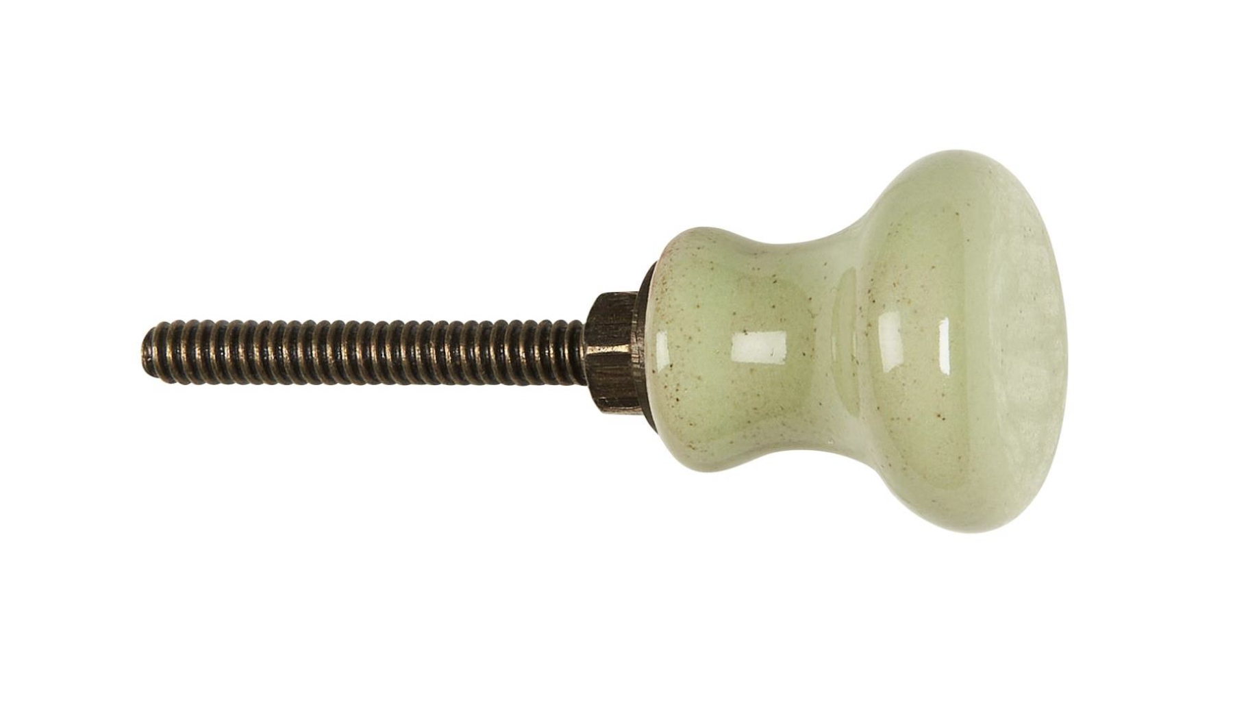 Klein en fijn klassiek kastknopje van keramiek in lichtgroene pastel pistache kleur met een klein spikkeltje her en der.